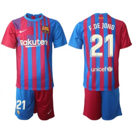 Men’s Barcelona #21 Frenkie de Jong 2021/22 Red Blue Home Soccer Jersey Suit
