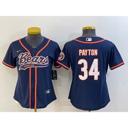 Women’s Chicago Bears #34 Walter Payton Navy With Patch Cool Base Stitched Baseball Jersey(Run Small)