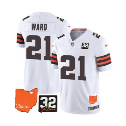 Men’s Cleveland Browns #21 Denzel Ward White/Brown 2023 F.U.S.E. With Jim Brown Memorial Patch Vapor Untouchable Limited Stitched Jersey